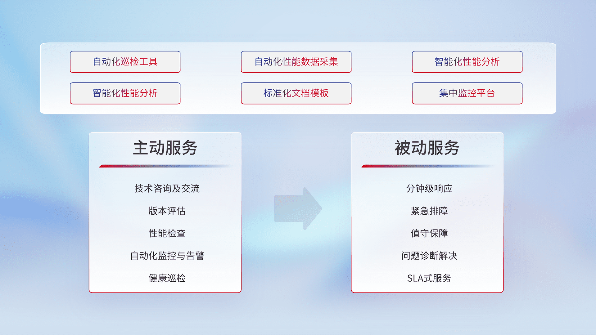 智能化工具和标准化文档,,,保障服务质量,,提供主动服务(包含技术咨询、、、、版本评估、、、、性能检查、、自动化监控与告警、、、、健康巡检)和被动服务包含(分钟级响应、、紧急排障、、值守保障、、、问题诊断解决、、、SLA服务)。。。。